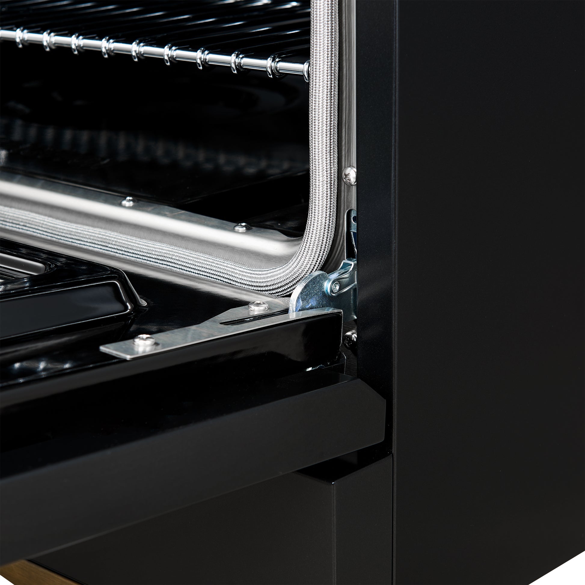 * Continuous cast-iron grates deliver even heat, ensuring stable cookware placement and smooth movement across the cooktop.