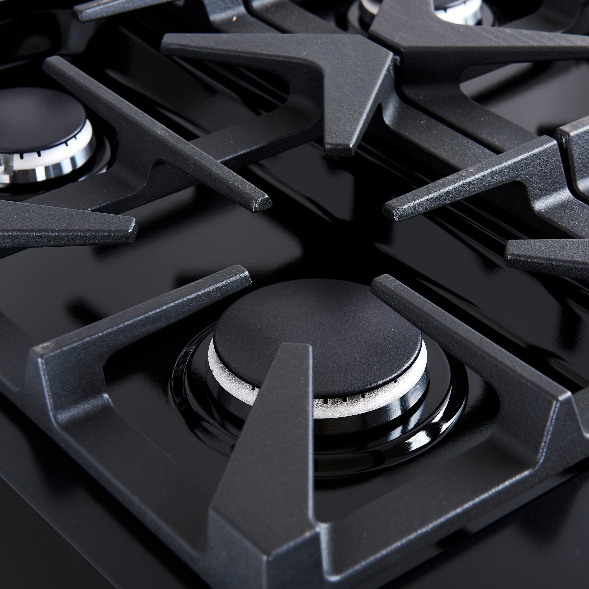 * Continuous cast-iron grates deliver even heat, ensuring stable cookware placement and smooth movement across the cooktop.