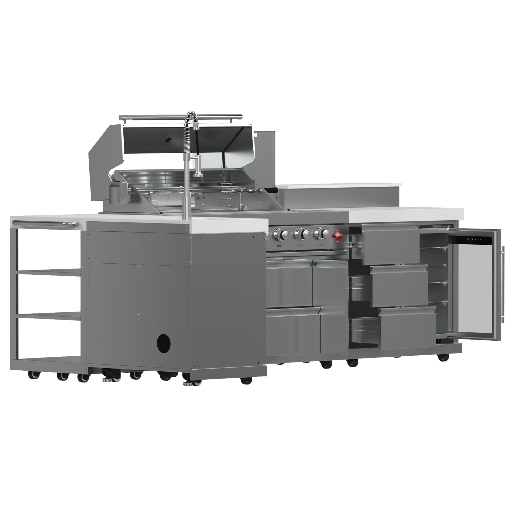 * Built to last with sturdy 304 stainless steel burners and chic white sintered stone countertops, this outdoor kitchen is a blend of durability and modern style.