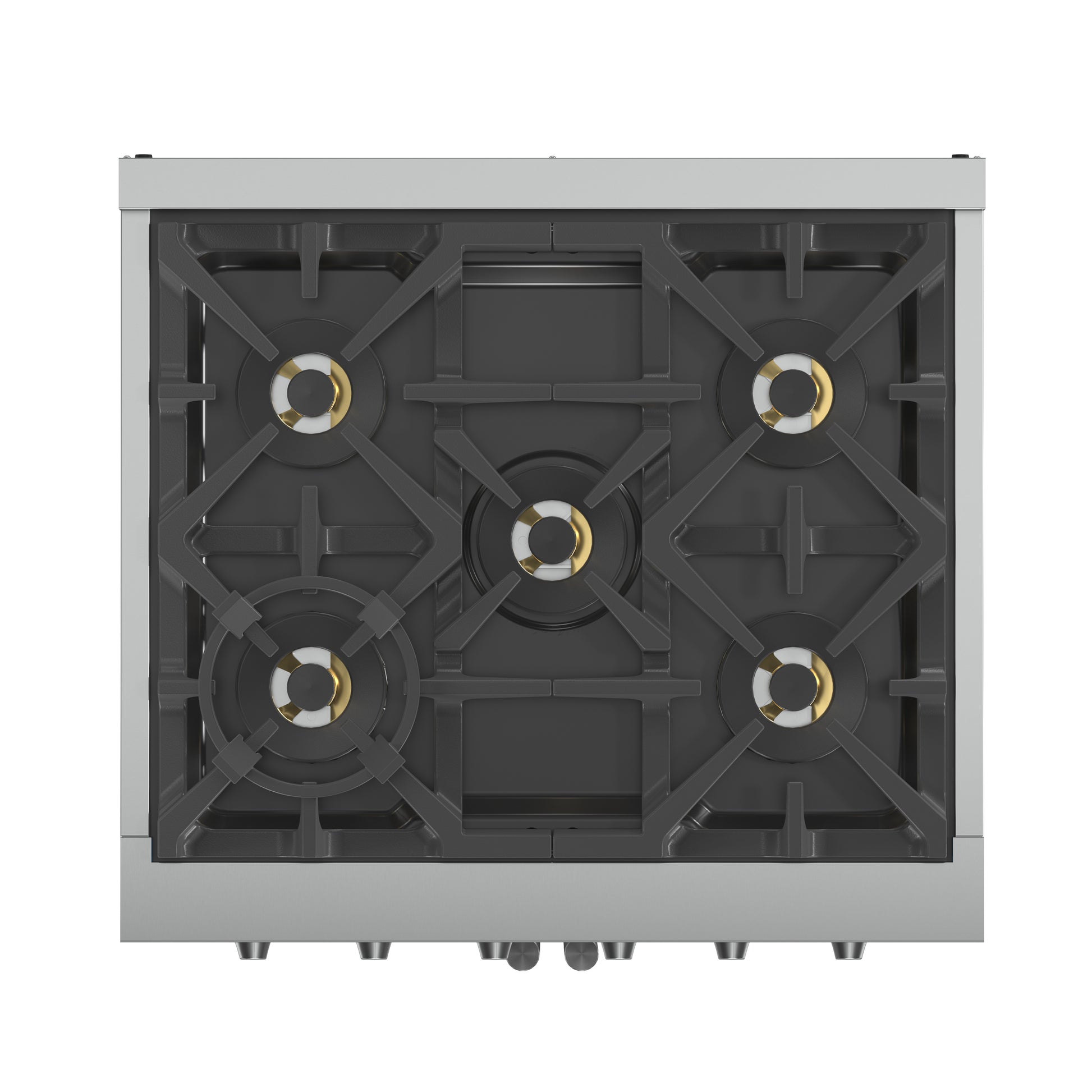 * 5 Sealed Dual-Ring Brass Burners combine a total stove-top out of 100,000 BTU.