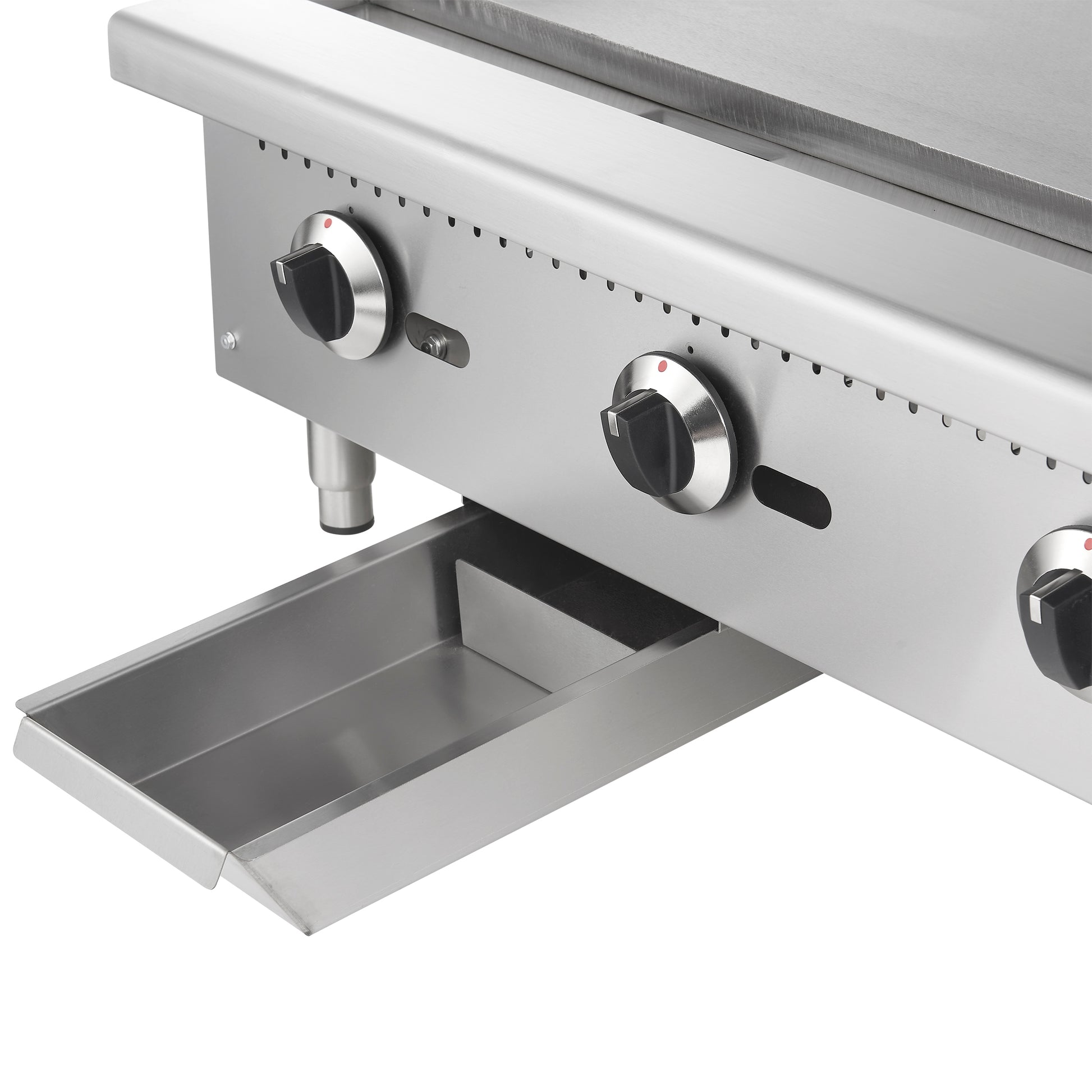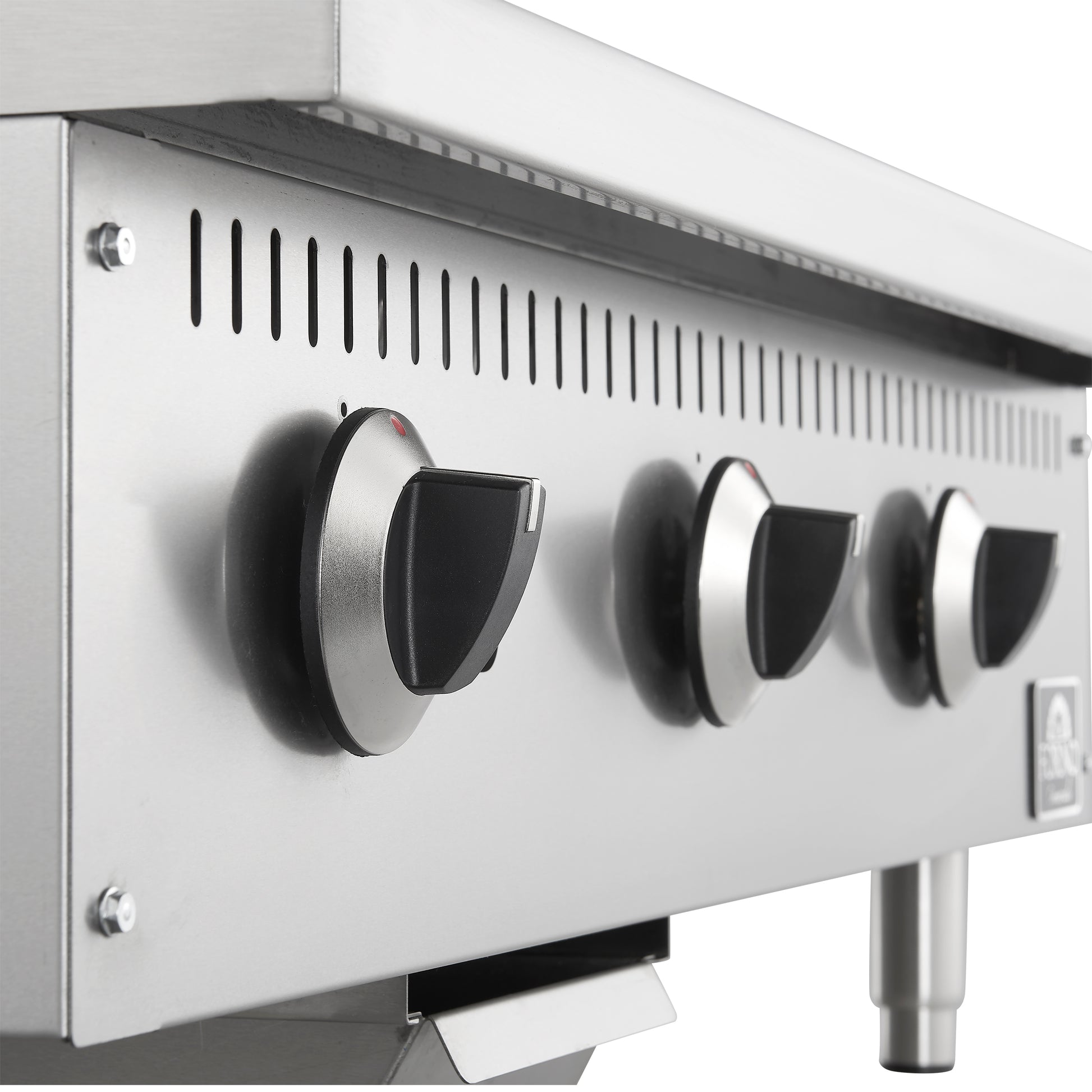 * Three heavy duty burners with independent controls for precise heat distribution across the griddle surface