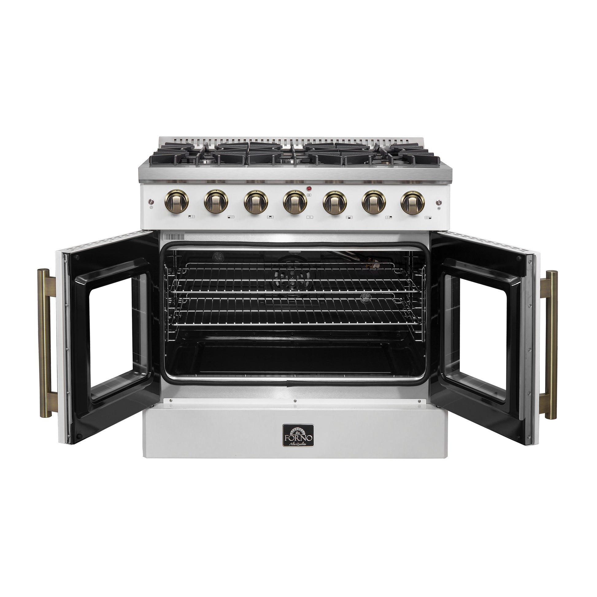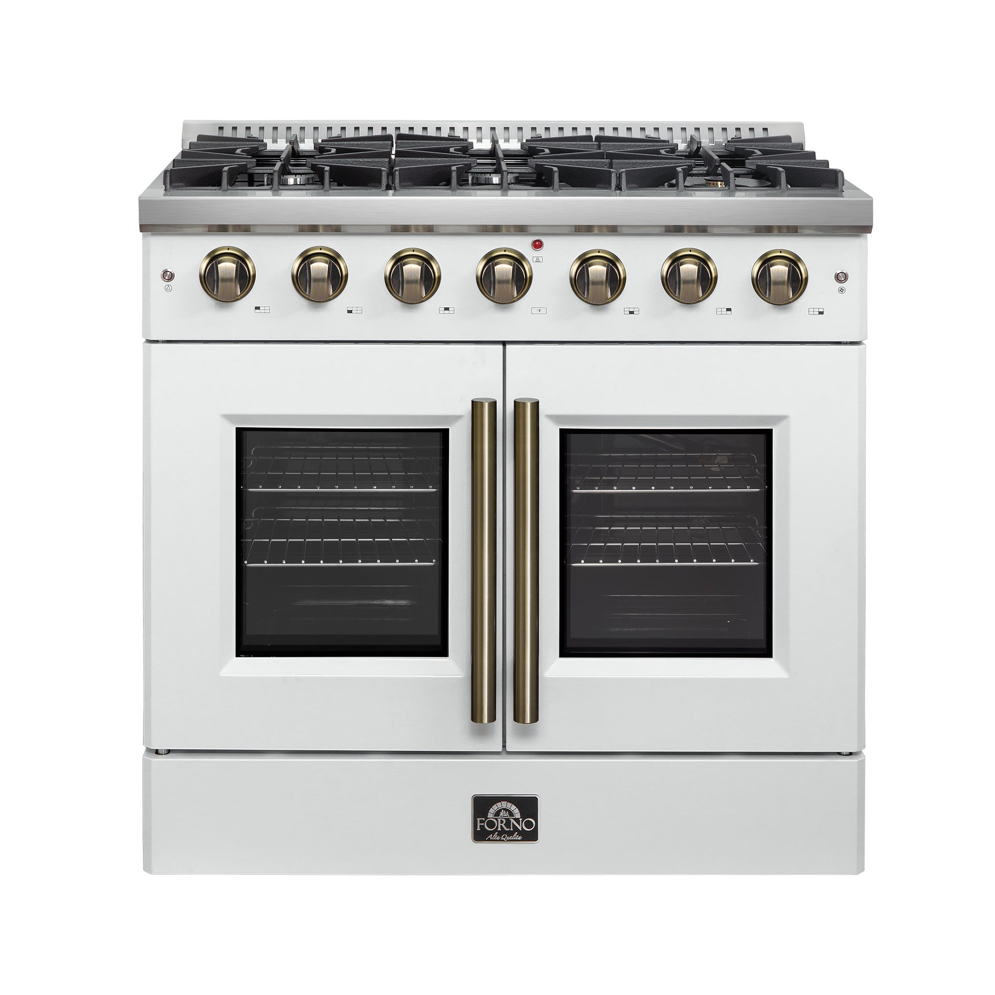 Forno Galiano 36-inch French Door Gas Range White and Antique Brass Design, 6 Sealed Burners 83,000 BTU, 5.36 cu.ft. Convection Oven