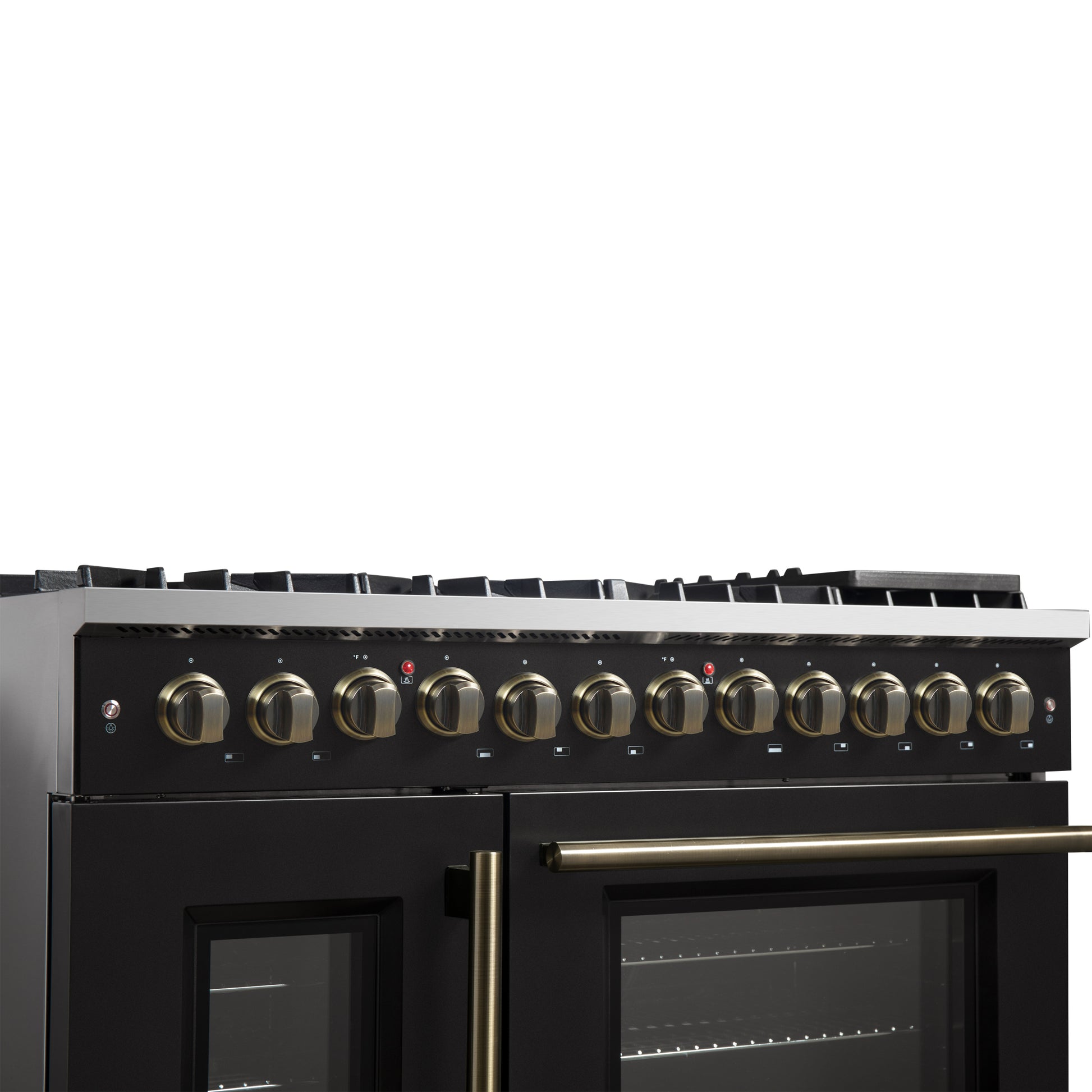 Forno Galiano 48-inch French Door Dual Fuel Range, Black & Antique Brass Design, 8 Sealed Burners - 107,000 BTU, Griddle, 6.58 cu.ft. Double Ovens