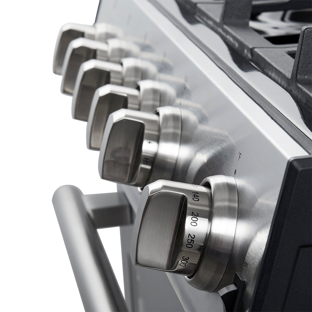 * Continuous cast iron grates ensure stability and mobility for cookware both on and off the heat source.
