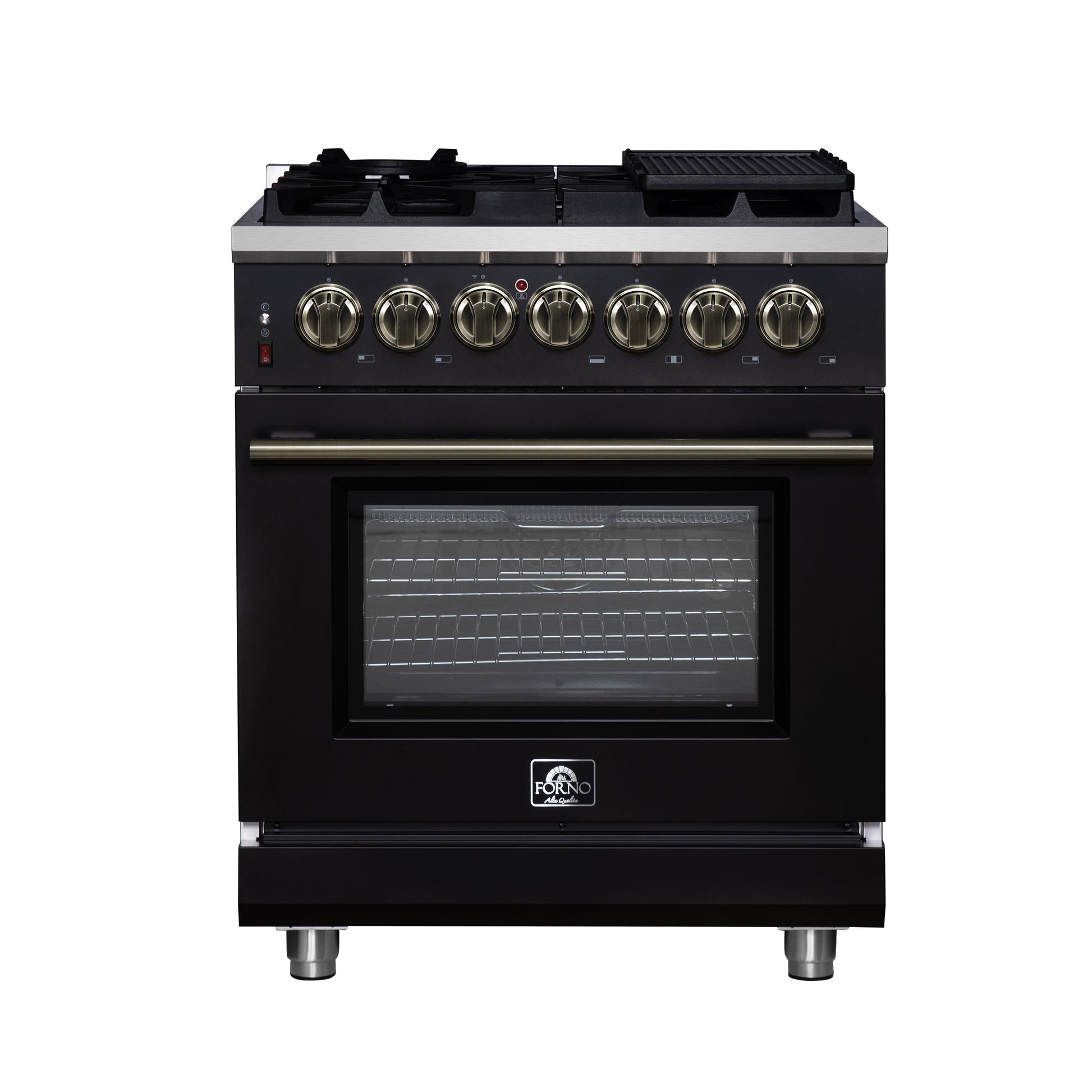 Forno Massimo 30 Inch Freestanding Dual Fuel Range in Black with Antique Brass Accessories, 4 Burners, 4.32 cu. ft. Convection Oven