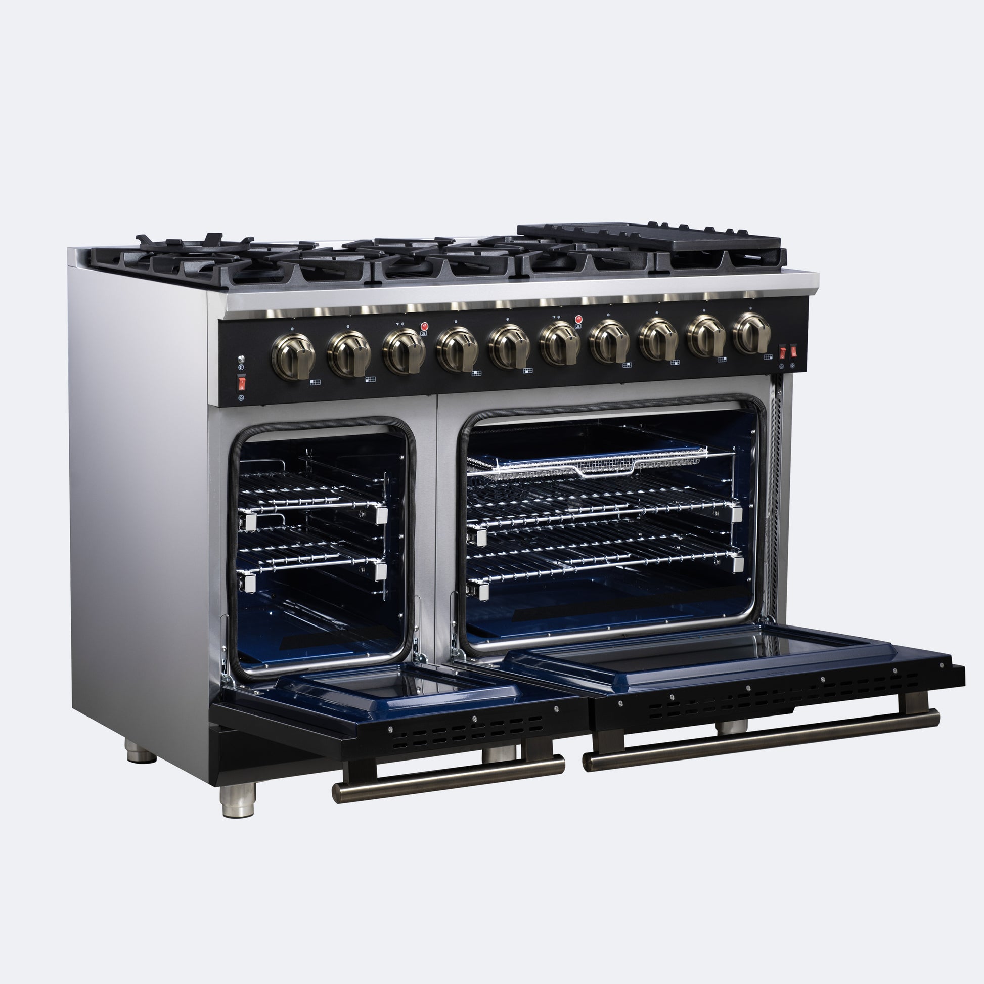 The Forno Massimo 48 Inch Gas Range in Black harmonizes professional style and durability with Antique Brass. Its 8 sealed burners, totaling 107,000 BTU, include a precision 20,000 BTU dual-ring burner that can simmer at 1,000 BTU. Continuous cast iron grates ensure stability on the enamel surface. The main oven of 4.32 Cu.Ft has a convection fan with 30,000 BTU Total Broil and Bake output. The secondary oven has a capacity of 2.26 Cu.Ft. with a 14,000 BTU Bake output. Both ovens have an impressive blue enamel interiors allowing for easy cleaning and 3-layer glass oven door window provides both heat retention and an unobstructed view. It features 2 telescopic racks per oven, an air fryer kit, a wok support, two reversible griddle, an LP conversion kit, and durable zinc-coated metal knobs. Elevate your kitchen with performance, convenience, and enduring elegance.