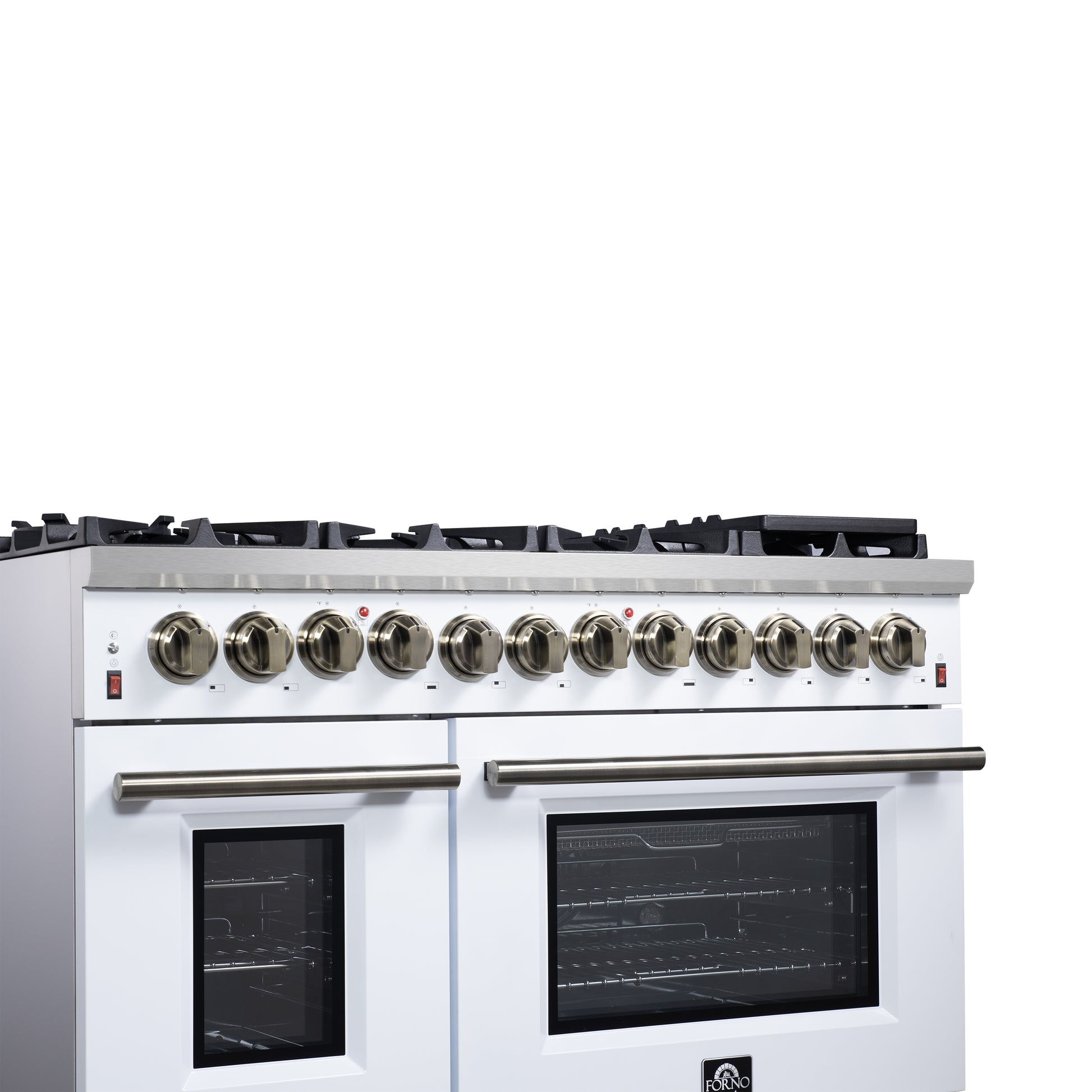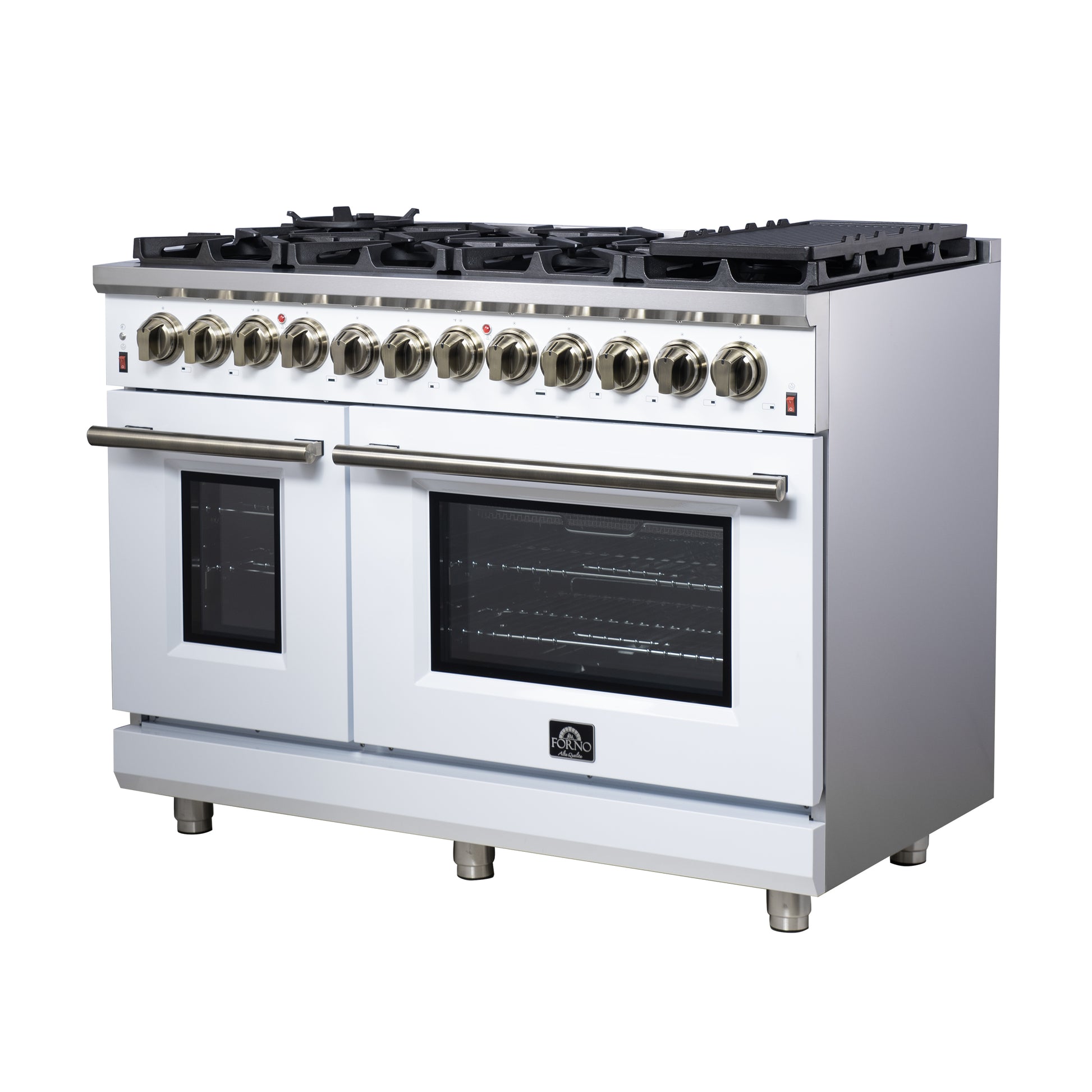Forno Massimo 48 Inch Freestanding Dual Fuel Range in White with Antique Brass Accessories, 8 Burners, 6.58 cu. ft. Convection Oven