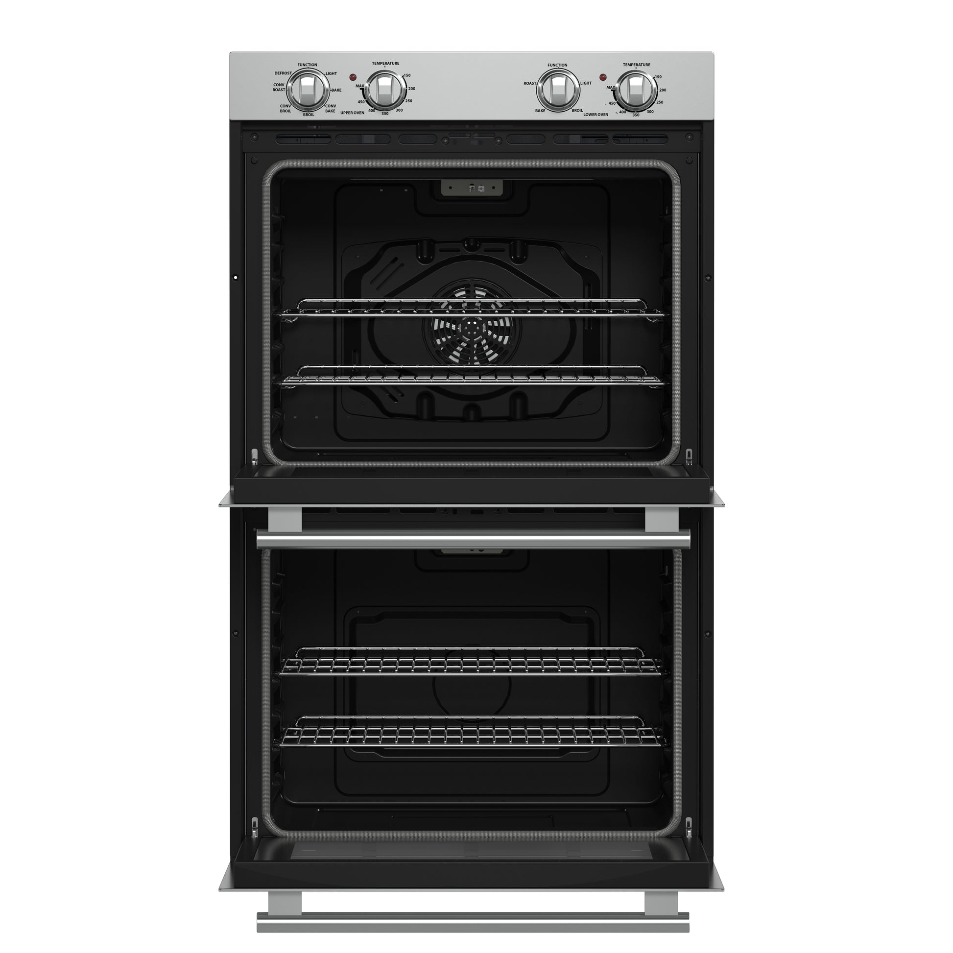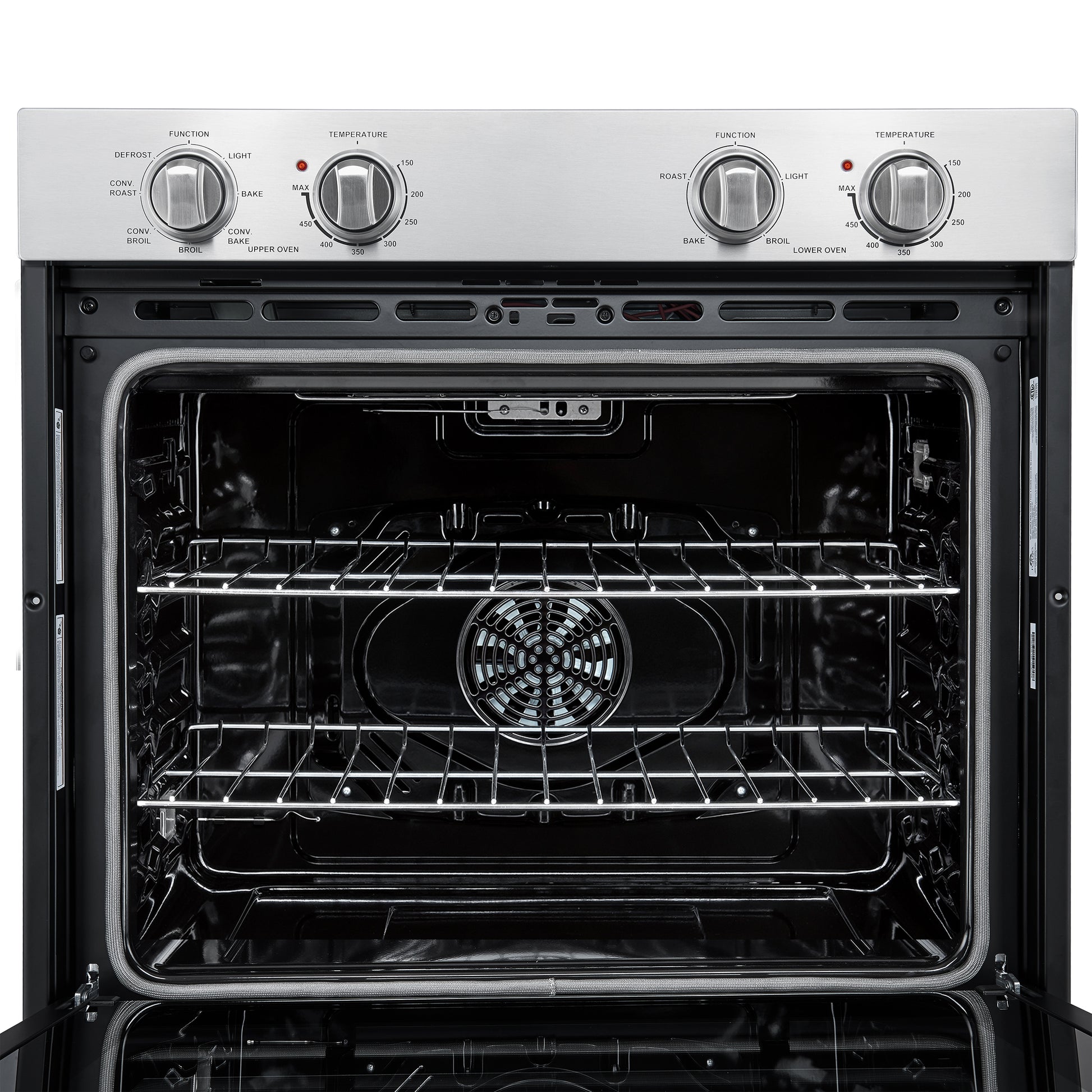 * Upper oven is equipped with a powerful 2000W broiler element, a 1500W bake heating element, and a 50W convection fan, ensuring quick, even heating for perfect cooking results.